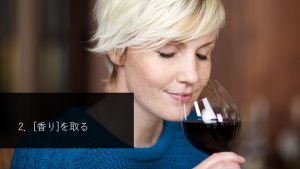 静かにグラスに鼻を近づけて香りを取り、次にグラスの脚を持ち、グラスの中でワインを回転させて(スワリング)、香りの変化を分析します。
